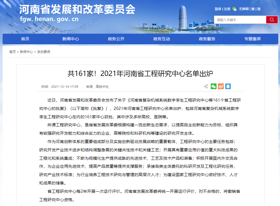 2021年12月14日,河南省发展和改革委员会发布2021年新建161家河南省工程研究中心名单,由副校长张凌杰教授主持申报,测绘地理信息学院、土木工程系、环境工程系、水利工程系等有关教师参与的“河南省水库大坝安全信息化管理工程研究中心”获批建设。