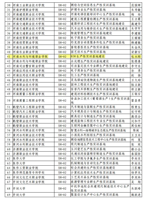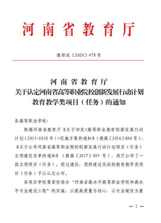 生产性实训基地建设被认定为河南省高等职业院校创新发展行动计划教育教学类项目