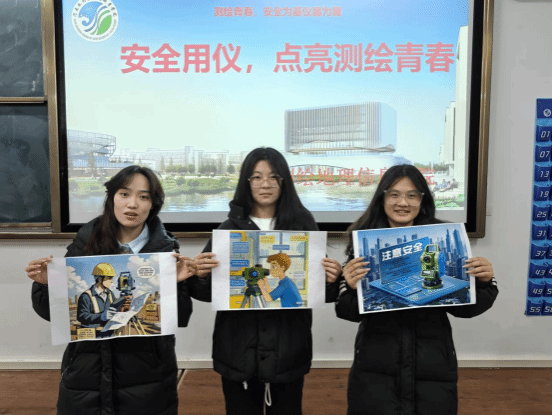 “海报设计”中,同学们围绕“仪器使用安全”精心创作了一批设计新颖、图文并茂的海报作品;“主题讲座”由学院专任教师通过现场演示、讲解与操作指导,深入阐述各类测量仪器的安全使用方法、维护保养技巧及常见故障排除方法;“模拟演练”邀请测量队备赛成员进行仪器安全操作模拟演练,同学们亲自上手操作全站仪、水准仪等测绘设备,切实掌握标准化操作流程与技术要领。活动最后,全体参与学生在条幅上签名,承诺遵守仪器安全规定。