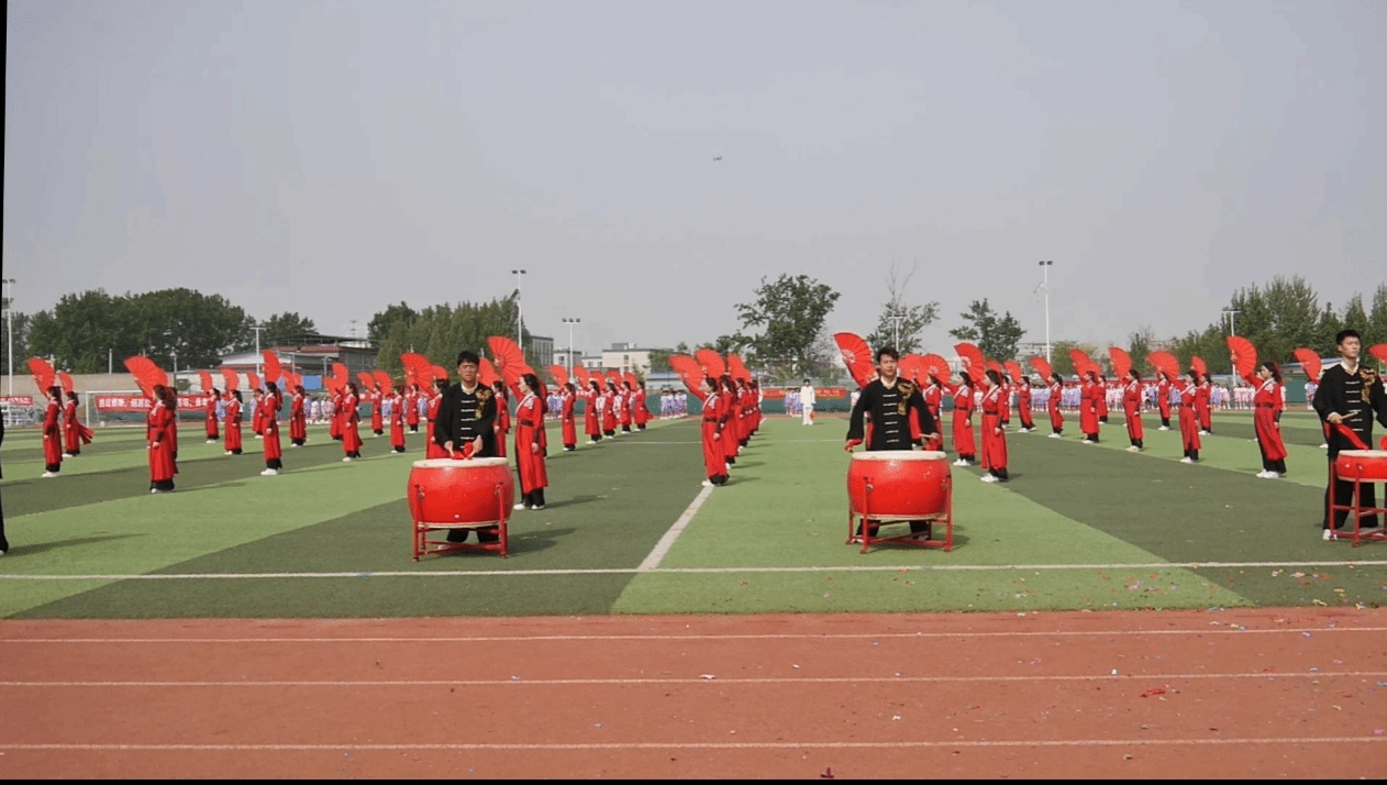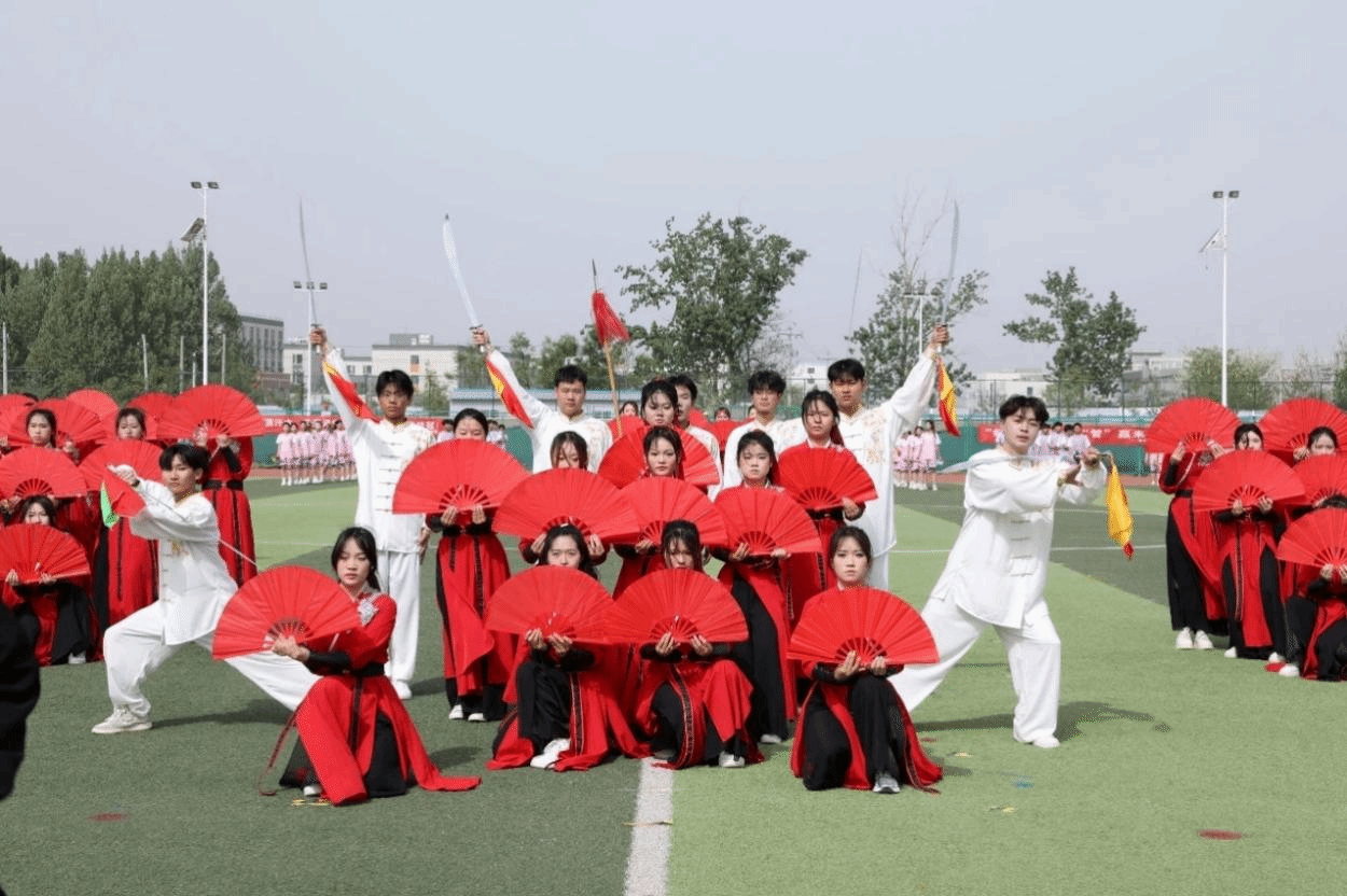 《鼓震山河,武动乾坤》由测绘地理信息学院80名学子倾情奉演,前方同学身着红袍,手持红扇,后方同学身穿白色武术服手持刀剑做出武术动作,展现出刚柔并济的氛围,是武术与舞蹈融合的表演。