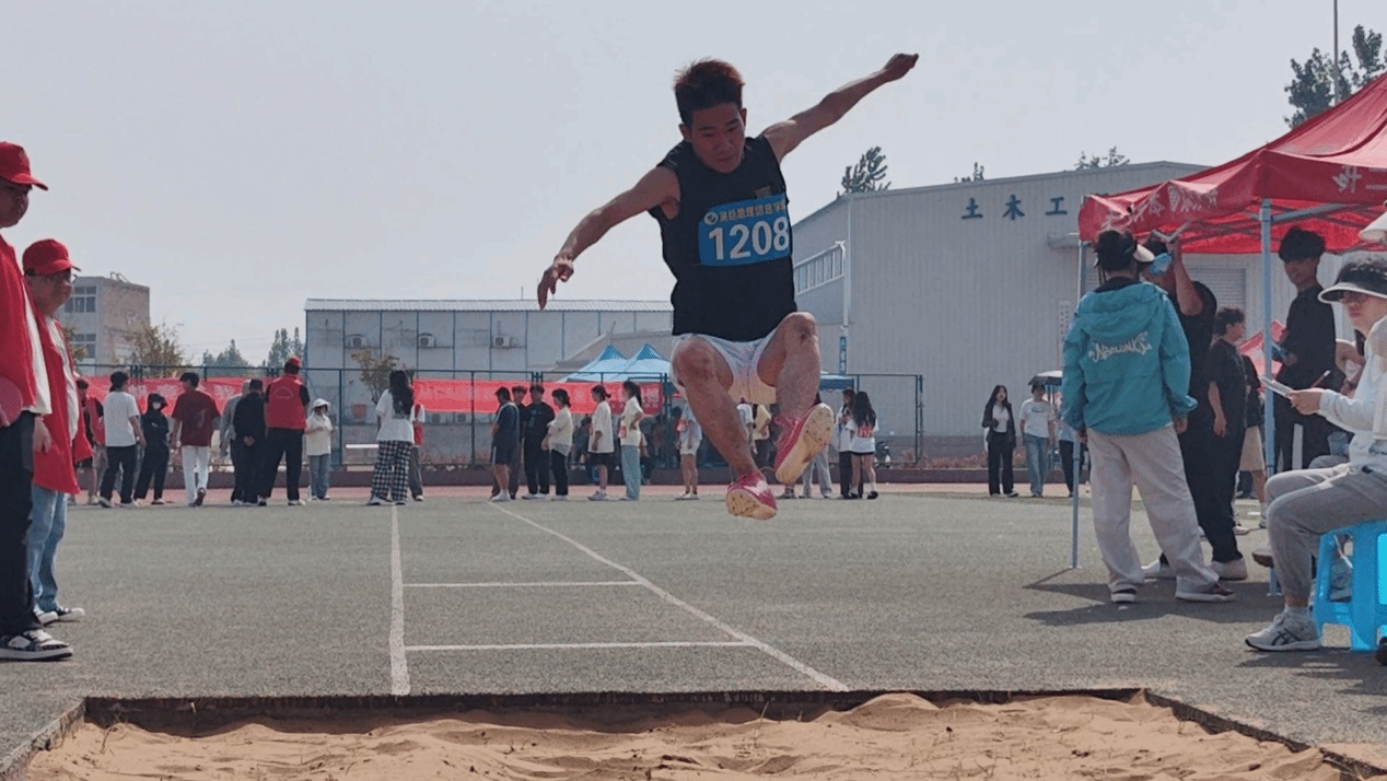 在跳远决赛中,23测量1班的毛哲荣获第一名。毛哲同学的每一次助跑都引来阵阵惊呼,第一名的成绩,是他用无数个黄昏的加练换来的勋章。