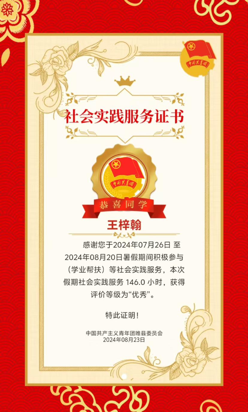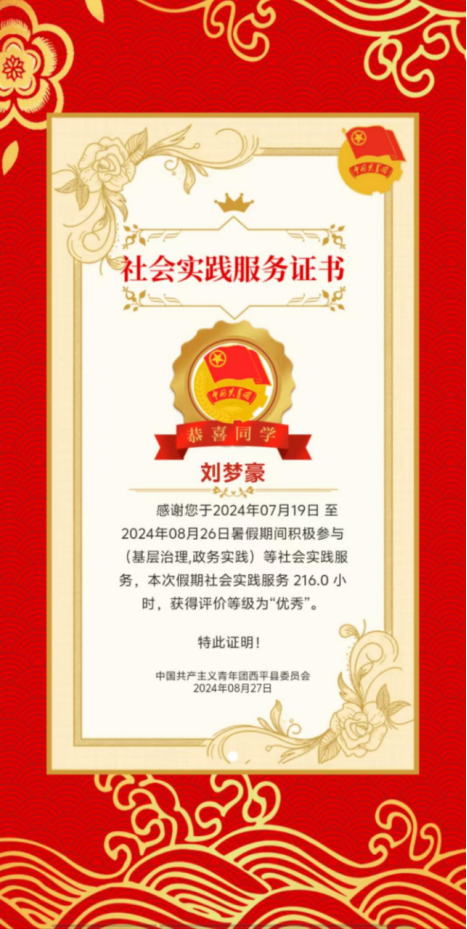 暑假期间,暑假期间,四位同学主动参加家乡社会公益服务,参与的社会实践项目包括多彩假期“艺”路“童”行、毛遂故里文化宣传、镇区文明劝导、学业帮扶、园林绿化、敬老院志愿服务等多项内容,累计服务时长分别达到167小时、216小时、175小时和146小时,不仅锤炼了意志品质,提升了社会服务能力,也为学校赢得了荣誉,用实际行动诠释了新时代大学生的责任与担当。希望水环学子以他们为榜样,积极投身社会实践,在担当中历练,在服务中成长。