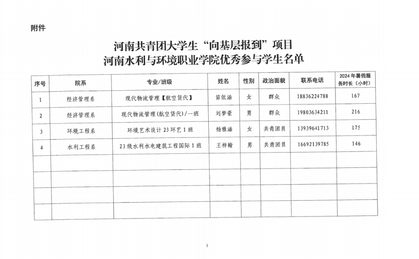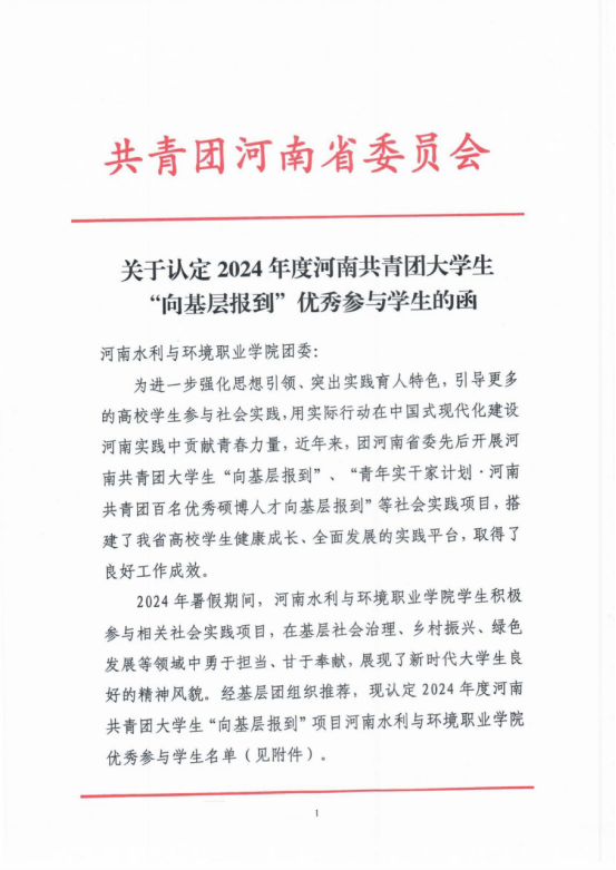 近日,ylzzcom永利总站线路检测2023级现代物流管理专业学生苗依涵、刘梦豪、2023级环境艺术设计专业学生杨雅涵、2023级水利水电建筑工程专业学生王梓翰在2024年度河南共青团大学生“向基层报到”项目活动中凭借卓越表现,荣获团省委颁发的“优秀参与学生”称号。