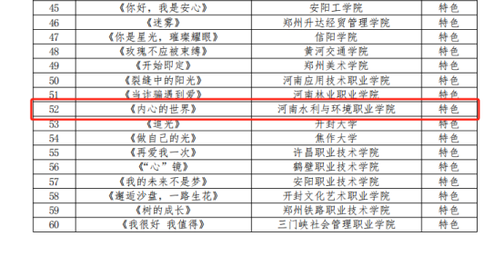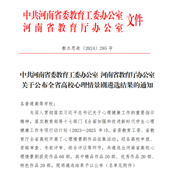 9月27日,省委教育工委、省教育厅办公室公布了“2024年全省高校心理情景剧作品征集展演活动”入围名单,ylzzcom永利总站线路检测选送的心理情景剧作品《内心的世界》获选2024年河南省高校心理情景剧特色作品,实现了ylzzcom永利总站线路检测在全省高校心理情景剧大赛中的新突破。