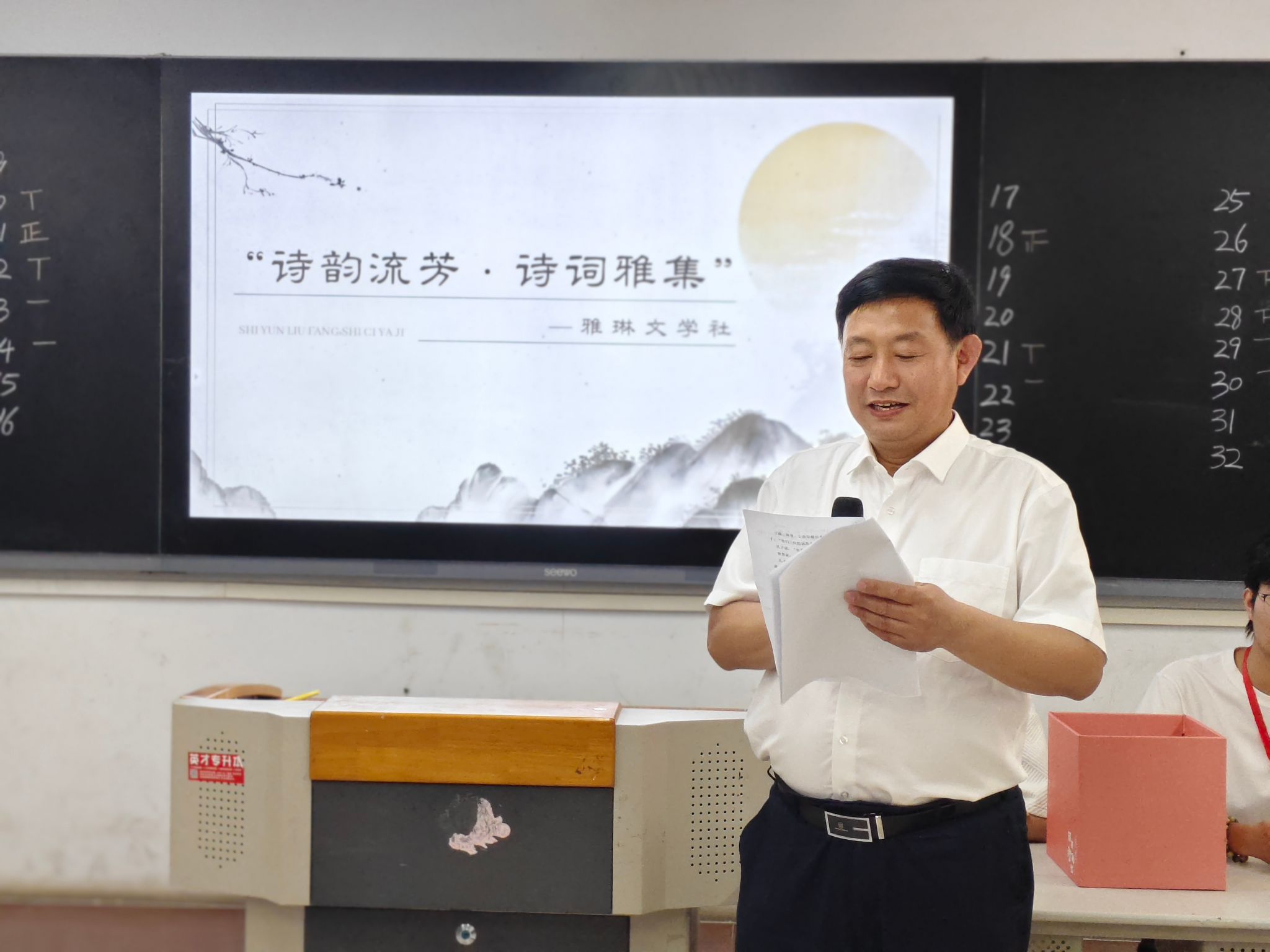 蒋彦成在致辞中对文学社发展提出三点要求:一是坚守文化育人初心,发挥文学社校园文化阵地作用,以诗词为纽带厚植师生文化自信;二是持续创新活动形式,探索多元化发展路径;三是完善竞赛机制,建立科学规范的评判体系。他引用《论语》经典名句,引导师生从传统文化中汲取学习方法与处世智慧。