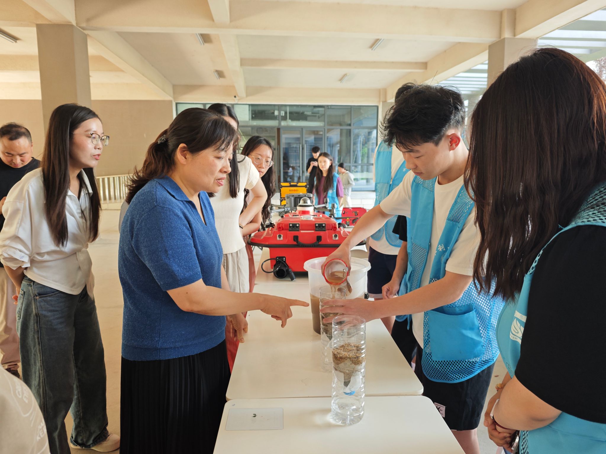 活动现场设置三大特色展区,构建起立体多元的学习体验空间。在文化展示区,水文化社团成员通过图文展板系统梳理我国水文化发展脉络,科普节水护水知识,让传统水文化与时代价值同频共振。在科技展示区,管道机器人精准检测演示、无人船与水下机器人作业实景模拟等智慧水利前沿技术吸引师生驻足,直观呈现科技赋能水利的创新成果。在节水竞技区,以“游戏化学习”为亮点,通过“水文化大富翁”“书签盲盒挑战”“水球护卫跑”等互动项目,将节水理念融入趣味体验,实现寓教于乐。