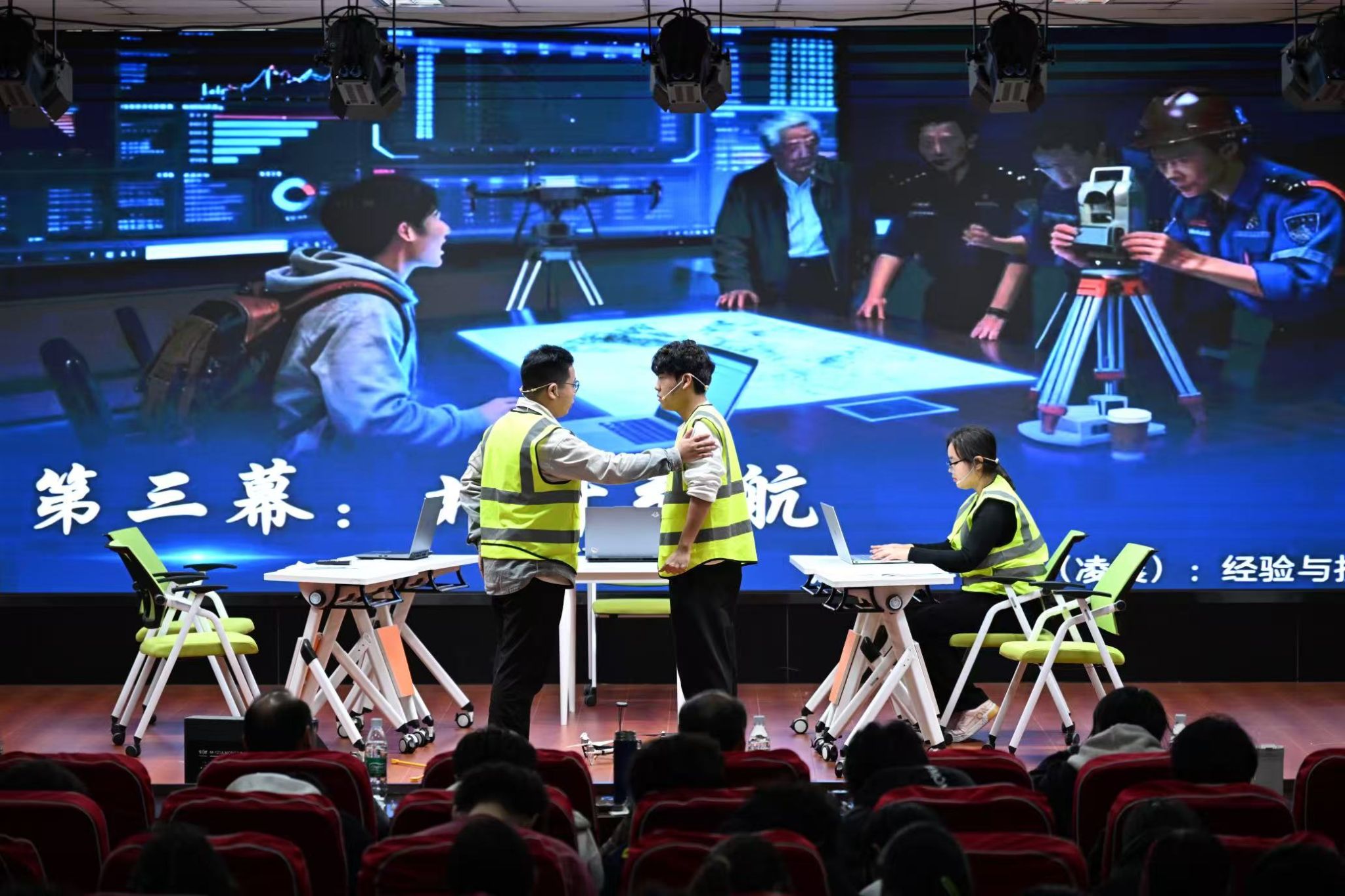 本次大赛旨在创新职业生涯教育模式,通过学生自编、自导、自演的情景剧形式,帮助学生在沉浸式体验中提前感知职场环境、理解职业角色、提升职业素养。决赛现场,各参赛剧目紧扣职场主题,内容涵盖了职业道德、技术创新、团队协作、职业选择等多元议题,生动展现了当代大学生对职业世界的观察、思考与探索。