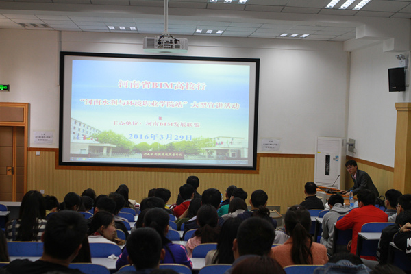 2016年3月29日下午,由河南BIM发展联盟发起的河南省BIM高校行活动在我院顺利举行。郑州大学土木工程学院副教授陈远,鲁班软件河南公司技术总监李金园,河南BIM发展联盟、河南省建设教育协会综合部主任宋任权,河南BIM发展联盟、河南省建设教育协会秘书处主任张慧明,以及我院土木工程系近200名师生代表参加了此次活动。本次活动由我院土木工程系主任包永刚主持,他代表学院对参加此次活动的河南BIM发展联盟的专家表示欢迎。