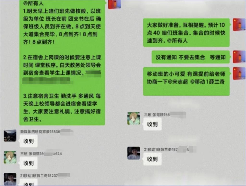 这是5月3日晚系党总支副书记刘彬和我通话的内容。挂断电话,我立刻查看班级群,关注学生们的动态并发布朋友圈,告诉大家不必惊慌。简单吃过晚饭,收拾好行李,到学校时已经快11点了,这时学校和系领导都在行政楼前等待着我们的归来。到指定的宿舍床位后,学校公寓办还给我们准备了床垫以及消毒用品。收拾好床铺已是凌晨,在了解各班学生的状态都比较稳定后,我才安心睡去,因为明天还要组织学生进行全员核酸检测。