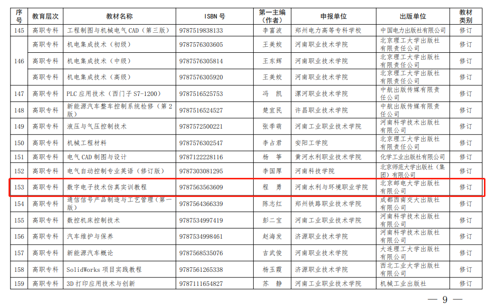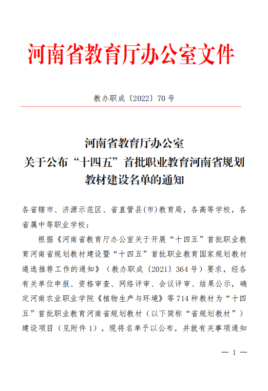近日,省教育厅下发《河南省教育厅办公室关于公布“十四五”首批职业教育河南省规划教材建设名单的通知》(教办职成〔2022〕70号),ylzzcom永利总站线路检测主编的11门教材成功入选“十四五”首批职业教育河南省规划教材建设项目。