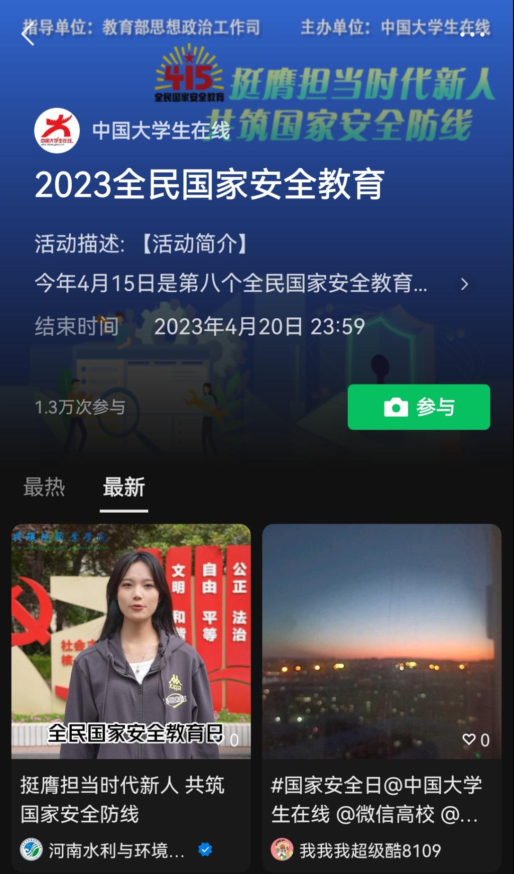 聚焦主题,扎实开展主题教育活动。组织师生学习习近平总书记关于总体国家安全观重要论述,利用手机、电脑等收看“国家安全教育日启动仪式暨大中小学思政课集体备课”展示活动,引导师生牢固树立国家安全底线思维,强化责任担当。以“千万师生同上一堂国家安全教育课”主题公开课、“国开大讲堂·国家安全教育公开课”为载体,组织师生系统学习国防教育课程,增强忧患意识和国防意识。各班级依托主题班会、团课等,通过观看视频、交流讨论等多种形式,学习涉国家安全法律法规,积极开展“反邪教警示教育”,提高学生防范邪教的意识和能力。动员广大师生参与“微博#国家安全日#话题”互动和“国家安全教育主题短视频线上接力活动”,师生踊跃参加。组织师生观看保密公益宣传片《保密防线》,因地制宜开展保密安全宣传教育活动,提升师生保密意识。