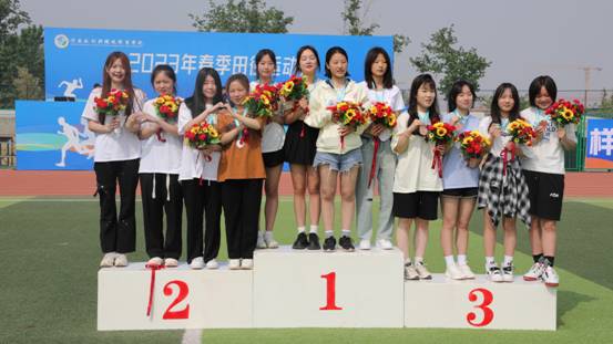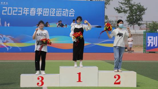 副总裁判长、体育教学部副主任孙缔英宣读运动会比赛成绩,校团委负责人贺天庆宣读精神文明先进集体获奖班级。