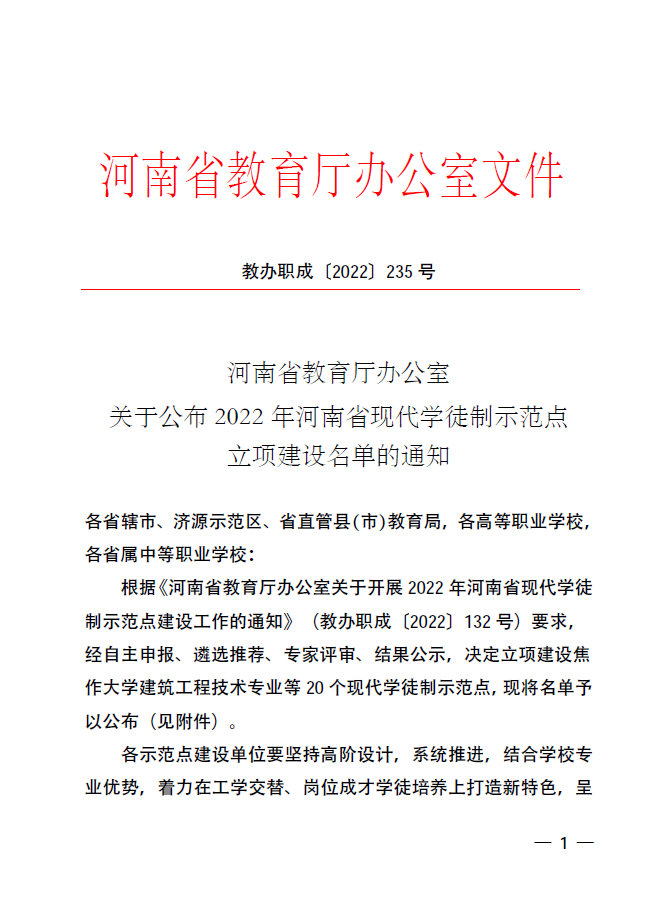 近日,河南省教育厅发布《关于公布2022年河南省现代学徒制示范点立项建设名单的通知》,ylzzcom永利总站线路检测水利水电建筑工程专业现代学徒制人才培养项目成功入选。