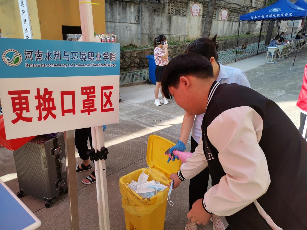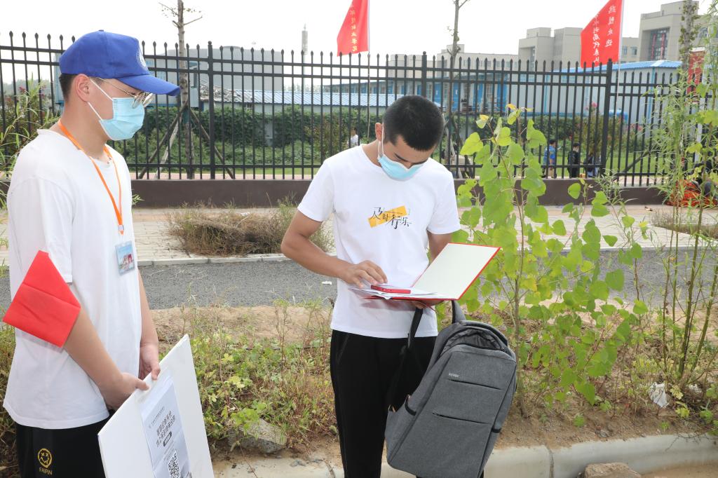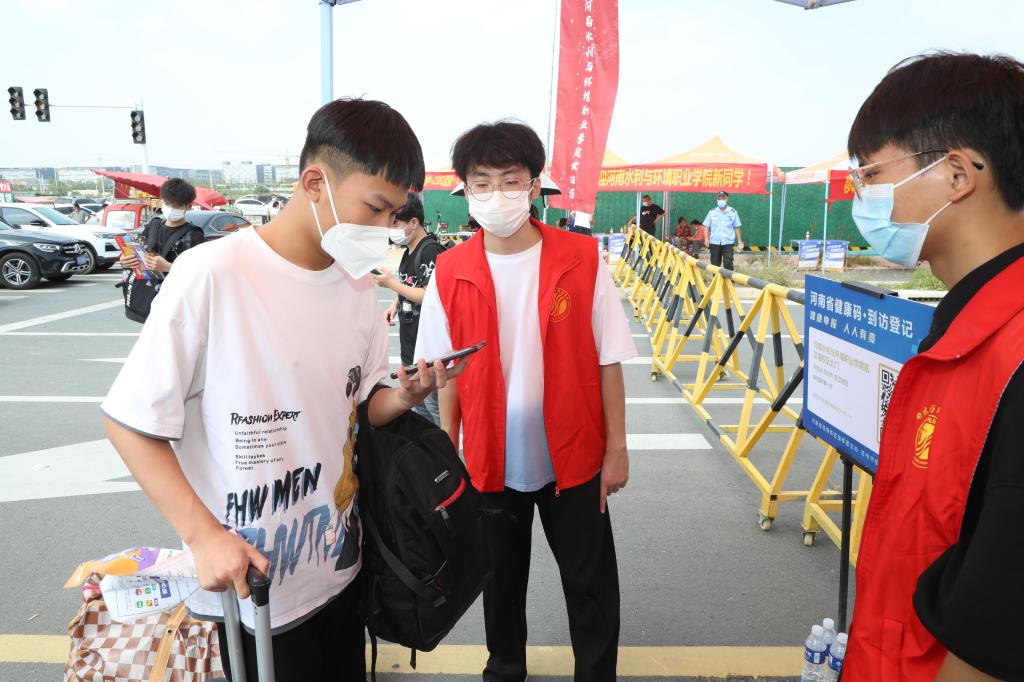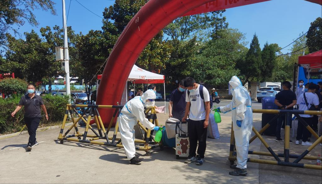 新生经过测温、扫码、消杀等系列流程进入学校。校内设置核酸检测点,第一时间为到校新生提供核酸检测服务。