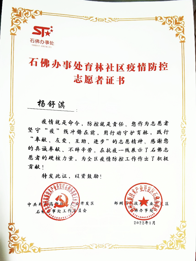 紧急时刻,家住该小区的ylzzcom永利总站线路检测环境工程系党员教师杨舒淇第一时间报名加入社区党员先锋队,每天早上六点半开始协助医护人员挨家挨户上门做核酸检测,重点照顾小区内的孤寡老人;中午在楼下执勤,协助做好小区居民居家隔离服务工作;下午两点至六点为小区居民送菜。在医护人员、社区工作人员和志愿者们连续十几天的共同努力下,最终在新年到来之际迎来了小区解封。志愿者们的工作得到了社区居民和办事处的高度认可,获得了表彰。