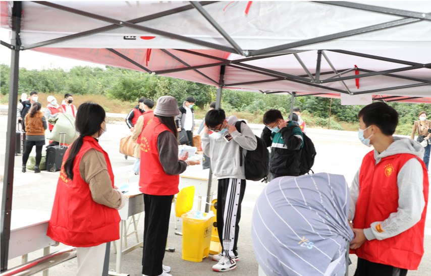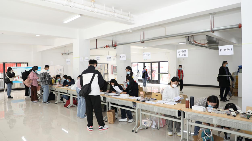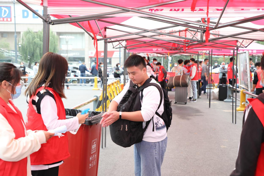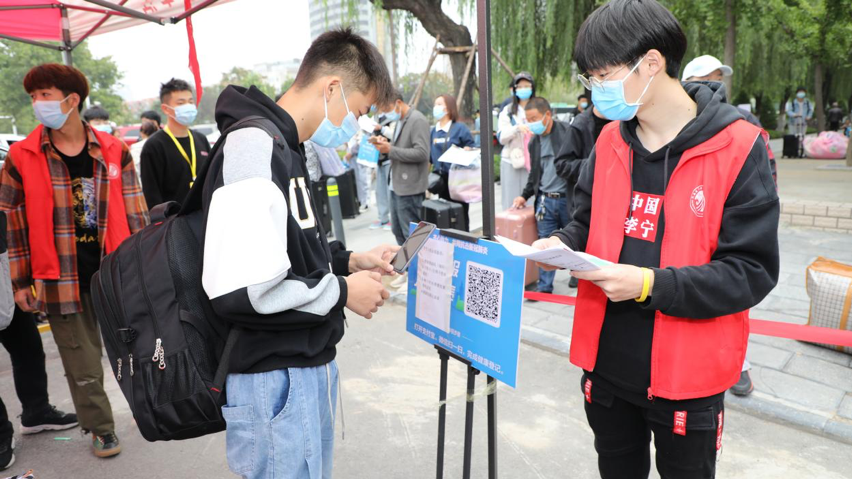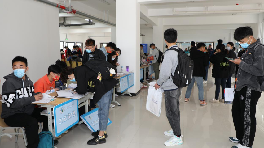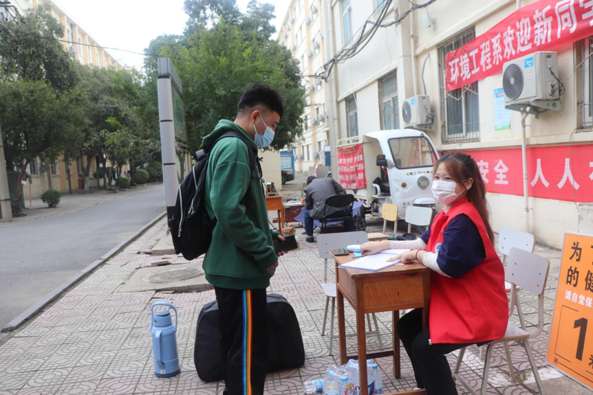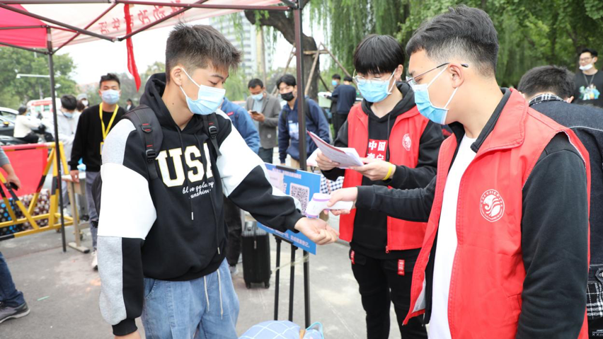 前来报到的新生在学生志愿者的引导下,有序通过新生报到专用通道,在完成健康码、行程卡核验,手部消毒、更换口罩、测量体温、行李消杀等流程后,分别到各报到点正式办理入学手续。