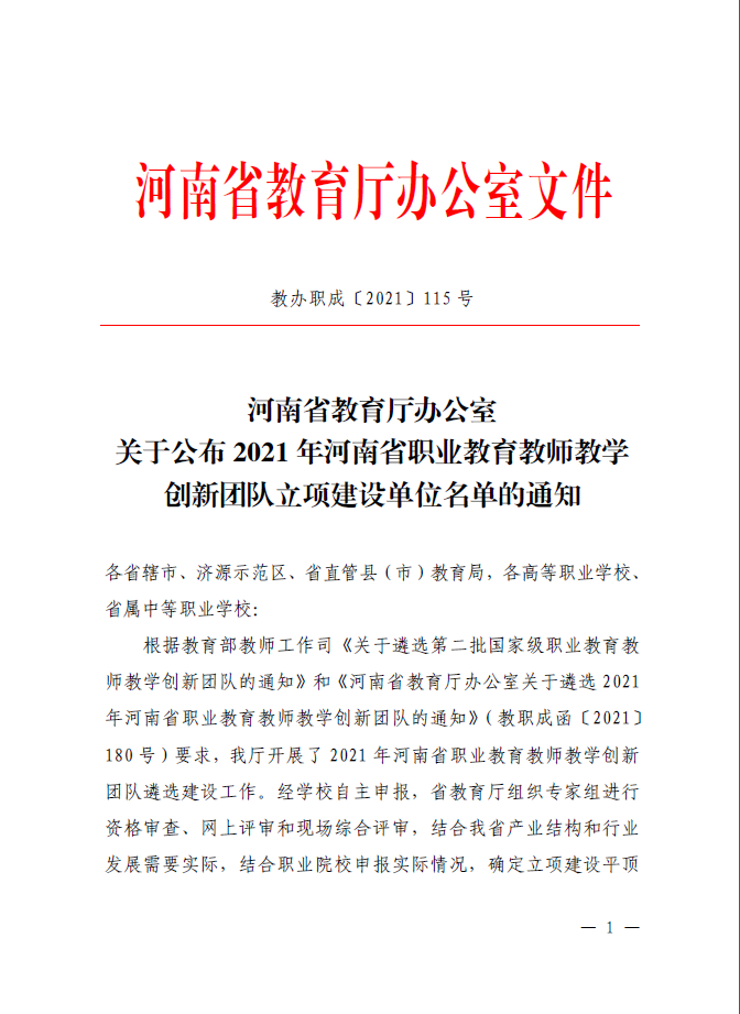 近日,河南省教育厅下发《关于公布2021年河南省职业教育教师教学创新团队立项建设单位名单的通知》(教办职成〔2021〕115号),由副校长张凌杰负责的物联网应用技术团队成功入选。