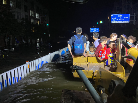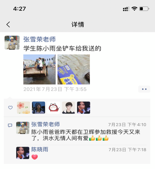 在受灾严重的卫辉市,经济管理系19物流3班学生陈晓雨和父亲自愿加入抗洪救灾、保卫家园的队伍,白天利用自家的铲车展开救援,晚上到河堤值班。当看到高中老师发布的求救信息后,立即自费为她和小区其他断水断电的受困群众送去物资用品。