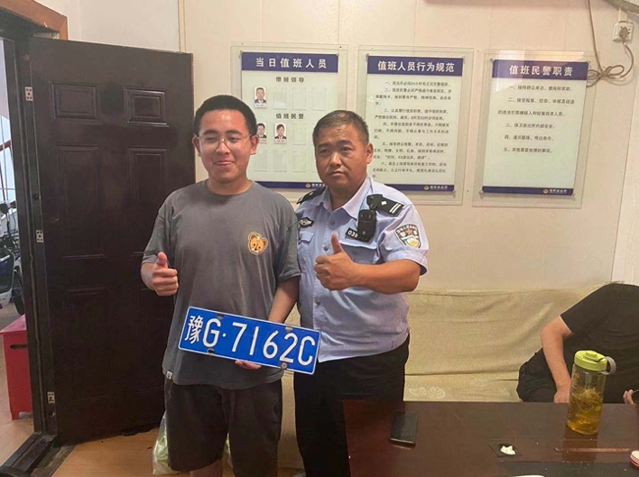 贾书涵将在防汛救灾中捡到的车牌送至附近派出所