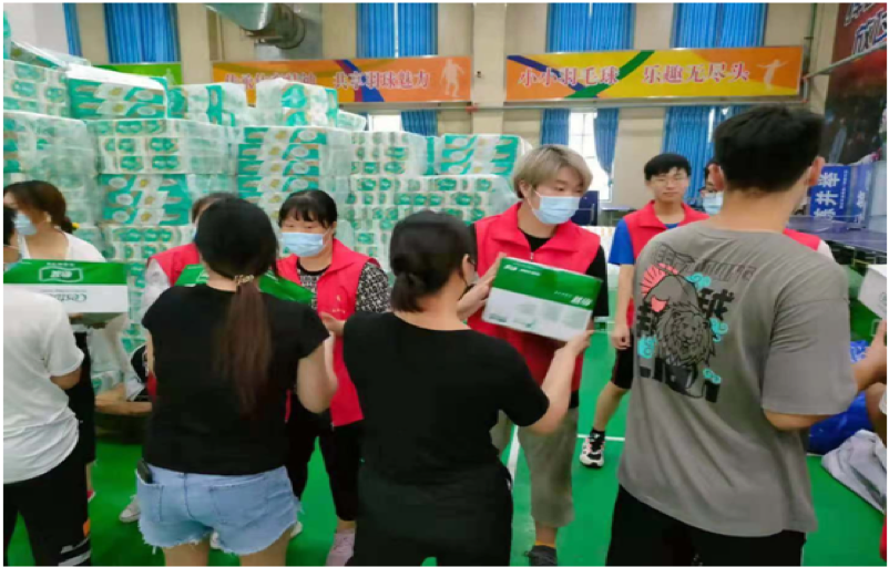 在登封实验高中体育馆,学生吴皓参与搬运、分发救灾物资。