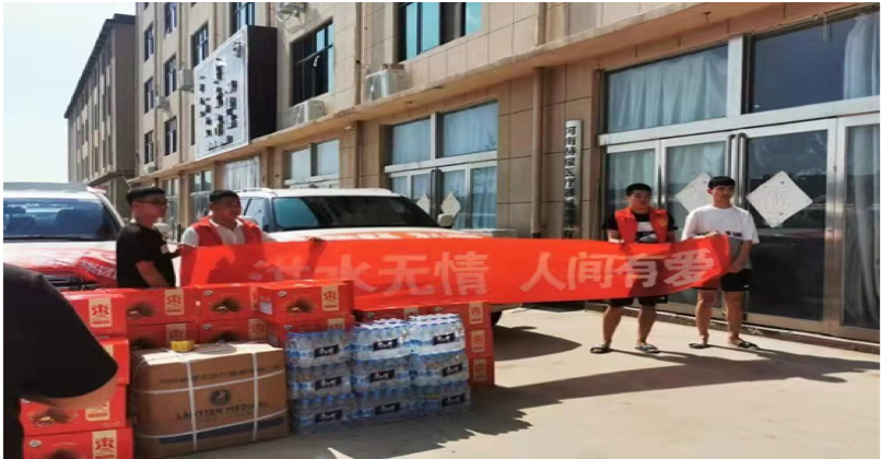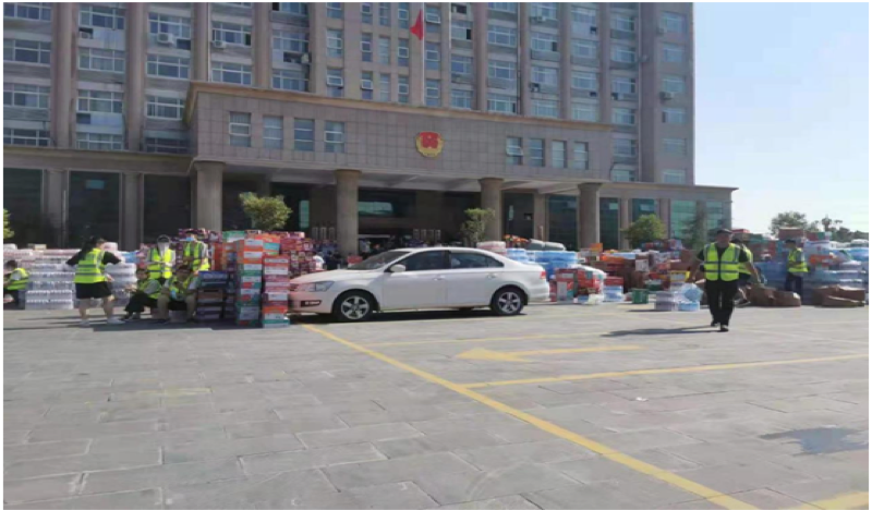 7月26日,在新乡市延津县环保局,学生靳雨鹏参与搬运救援物资。
