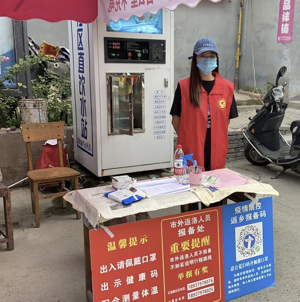 20级跨境电子商务1班学生王娜参与信息登记、维持秩序、测温消毒、卡点值守等志愿服务活动。