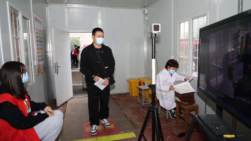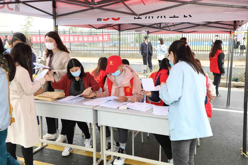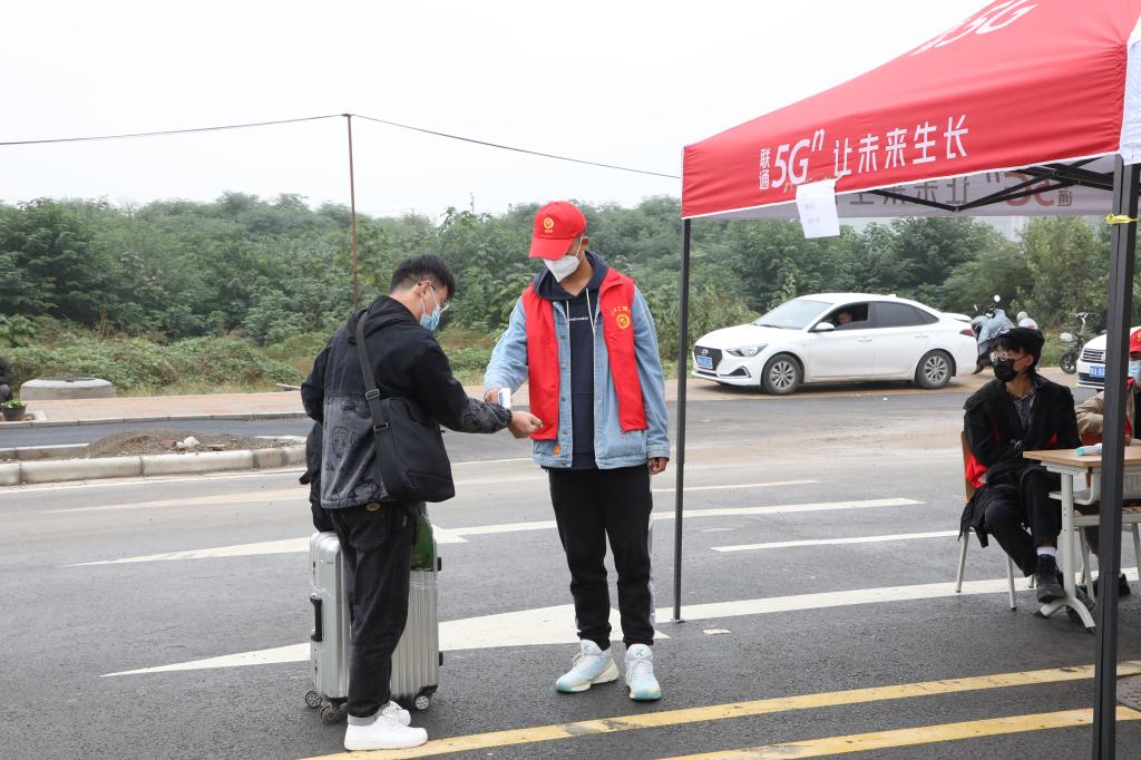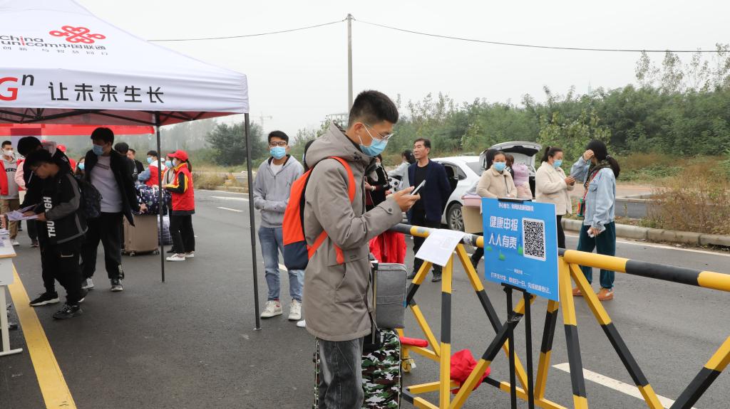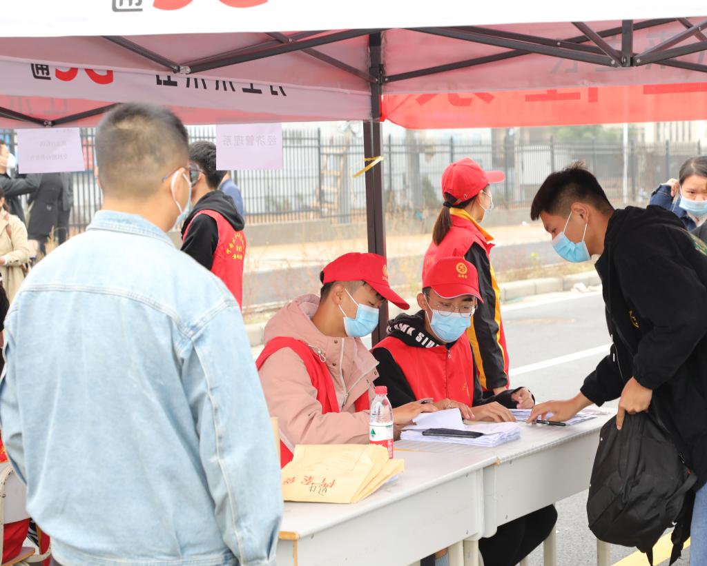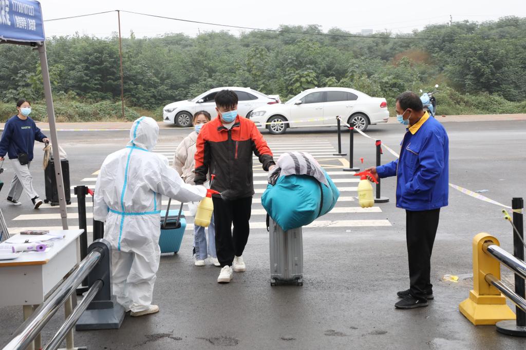 在校门口,学校设置学生返校专用通道,各系组织辅导员、志愿者参与学生返校报到审核工作,各报道点井然有序。在志愿者的引导下,返校学生依次查验身份信息、健康码和行程码,提交48小时核酸检测阴性证明、个人健康承诺书、个人14日健康登记表,并在行李消杀、口罩更换、体温检测后入校。