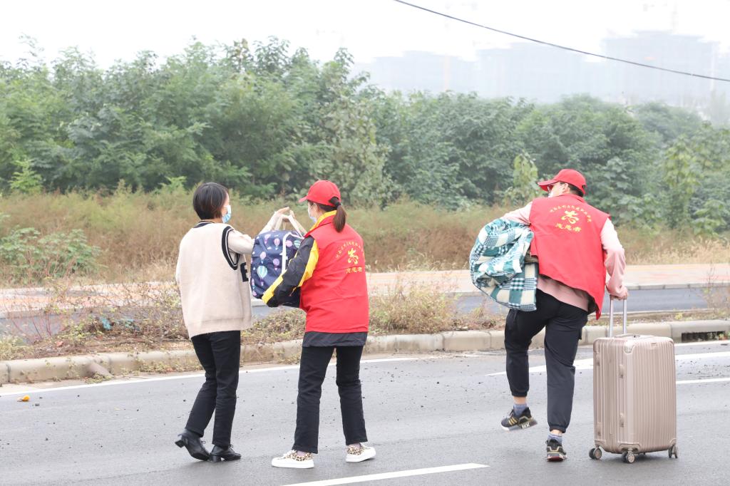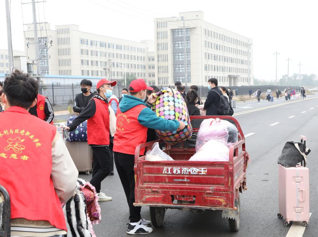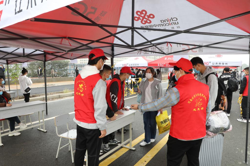 在接待点,志愿者们主动帮助返校同学搬运行李,校园内洋溢着青春的气息。