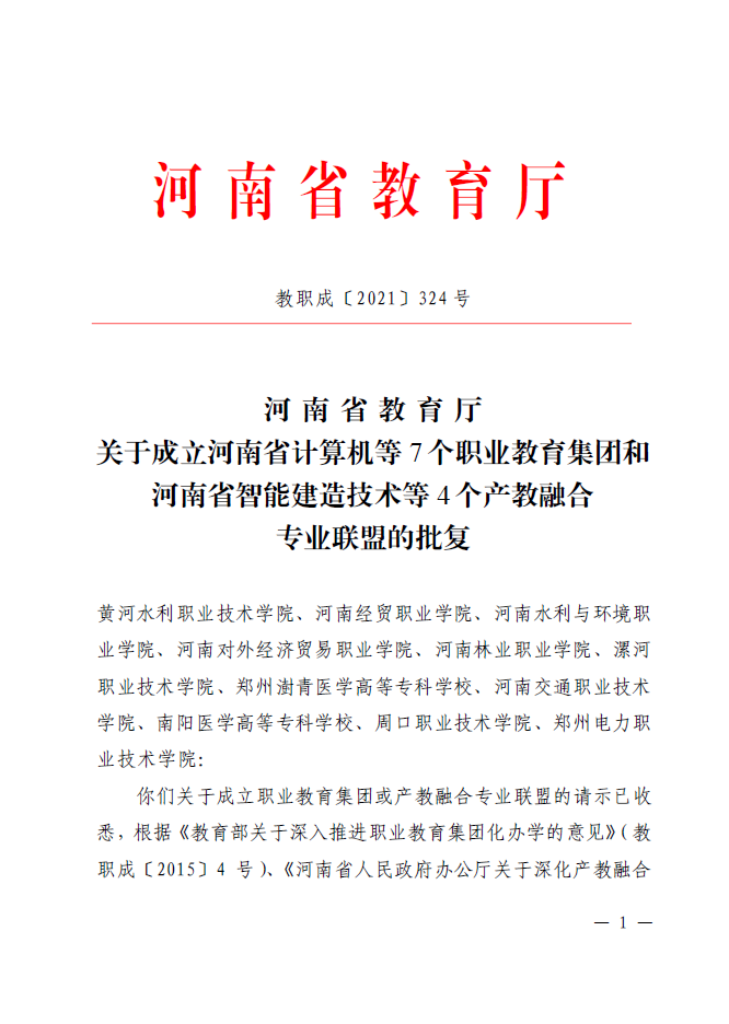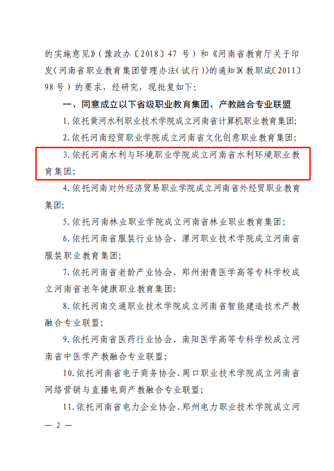 近日,河南省教育厅公布了《关于成立河南省计算机等7个职业教育集团和河南省智能建造技术等4个产教融合专业联盟的批复》(豫教职成〔2021〕324),ylzzcom永利总站线路检测牵头成立的河南省水利环境职业教育集团成功入选。