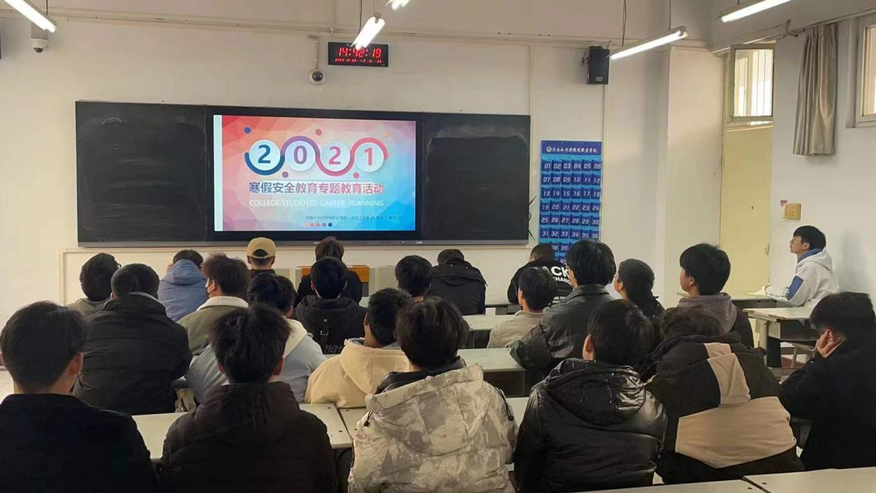 为进一步做好今冬明春和寒假前后新冠肺炎疫情防控工作,确保广大学生过一个祥和的春节,12月28日下午,校团委组织各团支部、班级在团课时间开展了疫情防控和寒假安全教育专题活动。活动从出行、交通、聚会、网络、个人财物、防火等方面进行了宣讲,促使学生提高寒假期间个人疫情防控和生命财产安全意识;教育引导学生强化使命担当,以学校网站、微信公众号等平台推出的在疫情防控阻击战中涌现的典型事迹为榜样,从我做起,积极配合学校疫情防控工作。