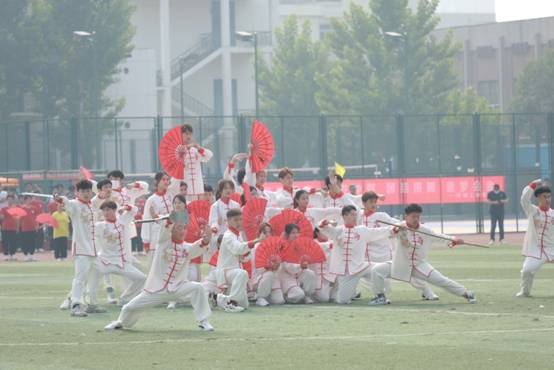 “万疆”太极扇表演,同学们把太极拳与太极扇相结合,姿态柔和,动作轻盈,展现出太极拳的飘然意境和太极扇的起伏飘扬,形成一种刚柔并进的动态美。
