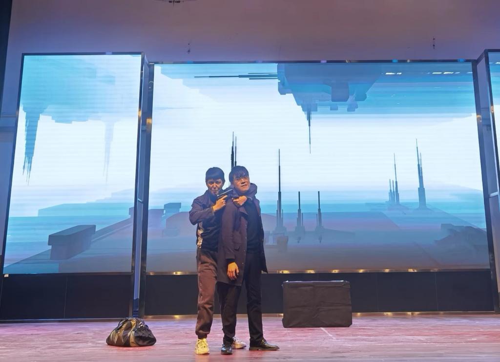 话剧有《人质》《放牛娃》《奔月》。《人质》以一个被迫无奈做了抢劫犯的可怜人与被欲望蒙蔽双眼吃到苦果的打工人的故事展开叙述,看似的两个“坏人”之间也充满了温情与善良。《放牛娃》讲述了一个放牛娃与老牛之间以死后灵魂状态相遇而展开的故事,放牛娃为救人而被日本人杀死,老牛为救放牛娃而死,他们都是为救别人而奉献出自己的生命,短短的话剧片段却由小及大地展示出了舍己为人的大无畏精神。话剧《青衣》是一个具有预言和哲学意义的当代佳作,著名青衣演员筱燕秋,把持《奔月》中的A角而丧失理智,二十年前把滚烫的开水泼在师辈演员李雪芬的脸上,二十年后《奔月》复出,她继续霸占舞台,不容许亲传弟子春来上戏。自私与孤傲,导致神形疲惫,走向崩溃。筱燕秋无所不在,中国女性特有的韧性使她们在作出某种努力的时候,通身洋溢出无力回天还挣扎、到了黄河不死心的悲剧气氛。