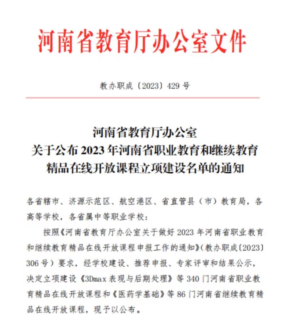 近日,河南省教育厅发布了《河南省教育厅办公室关于公布2023年河南省职业教育和继续教育精品在线开放课程立项建设名单的通知》(教办职成〔2023〕429号),ylzzcom永利总站线路检测7门课程入选河南省职业教育和继续教育精品在线开放课程立项建设。