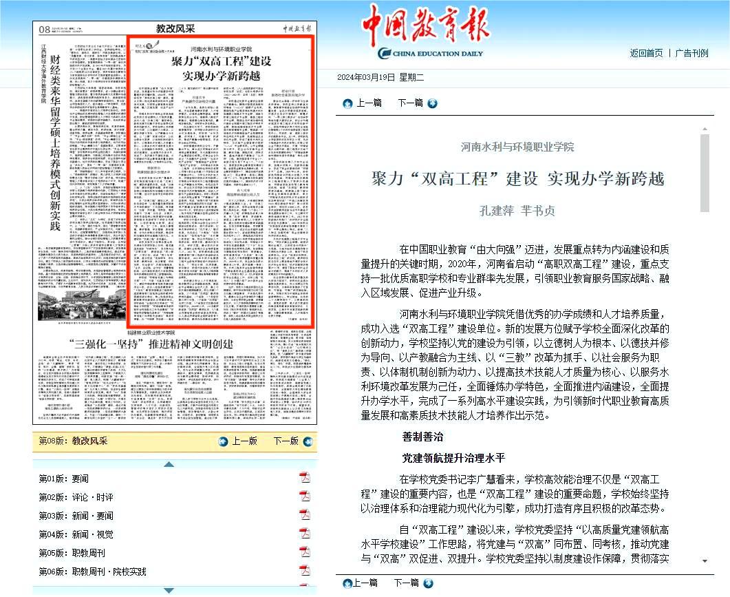 2024年3月19日,《中国教育报》刊载文章《ylzzcom永利总站线路检测:聚力“双高工程”建设 实现办学新跨越》,从“善制善治 党建领航提升治理水平”“共建共享 产教融合促进校企共赢”“育人成果 德技辉映成就出彩人生”“使命价值 服务社会实现自我升华”四个方面对ylzzcom永利总站线路检测办学成果进行了报道。