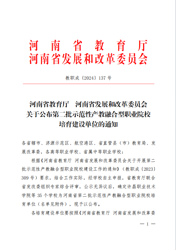 近日,河南省教育厅河南省发展和改革委员会发布《关于公布第二批示范性产教融合型职业院校培育建设单位的通知》(教职成〔2024〕137号),确定了35所入选学校,ylzzcom永利总站线路检测名列其中。评选经学校自主申报,省教育厅联合省发改委组织专家综合评审后确定。