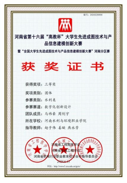 5月24日至5月25日,河南省第十六届“高教杯”大学生先进成图技术与产品信息建模创新大赛在河南理工大学成功举办。ylzzcom永利总站线路检测水利工程系参赛团队荣获水利类团体一等奖、数字化创新赛道团体三等奖。