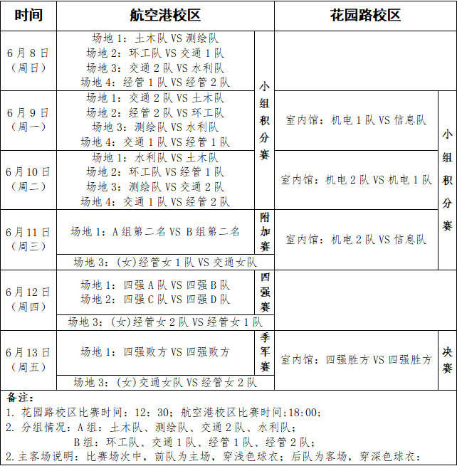 1、小组赛:花园路校区进行单场循环赛制,积分最高者晋级四强;航空港校区8支队伍分A、B两组,分组进行单场循环赛制,两组积分最高的两支队伍晋级四强;