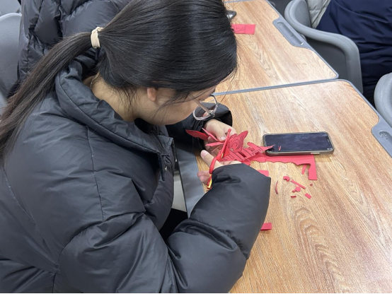 活动内容丰富,形式多样,包含写春联、剪窗花、猜灯谜、做花灯、乒乓汤圆DIY、趣味游戏和小型文艺表演等。写春联环节,同学们在活动现场泼墨挥毫,以墨香传递祝福,一幅幅寓意吉祥的春联跃然纸上;剪窗花环节,一把剪刀、一张红纸、一双巧手剪出了“中国结”、红灯笼等栩栩如生的新春元素作品;猜灯谜环节,同学们自己制作的花灯下悬挂着灯谜,大家在灯笼下或低头沉思、或热烈讨论、或欢呼雀跃,现场热闹非凡;乒乓汤圆DIY环节,大家在乒乓球上绘制自己喜欢的新春图案或写下新春祝福,制作完成后放入抽奖箱,在文艺表演的抽奖环节凭此领取小礼品;在文艺表演中,同学们带来的《大城小爱》、《新年快乐》等脍炙人口的歌曲和酷飒的舞蹈《Rollin'》,令大家回味无穷;“‘元’源不断加字乐”、“‘旦’愿成真添字欢”等趣味游戏让大家感受到了浓浓的节日氛围。
