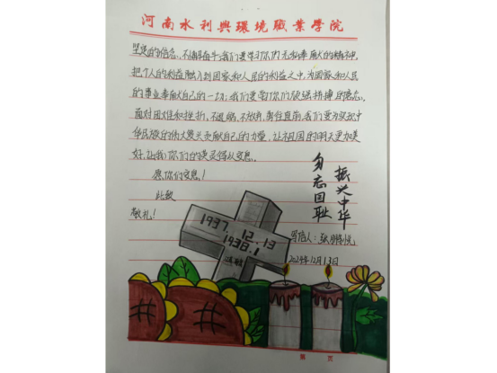 大家围坐在一起观看历史纪录片,更加直观地了解历史,感受先烈的英勇事迹,分享自己所了解的历史故事,交流内心的感悟与体会。在思想碰撞中,同学们对革命先烈的崇敬之情愈发浓厚。12月13日,同学们的书信在纪念书信展览区进行了展示。一封封满载深情的书信,不仅是对革命先烈的缅怀与致敬,更是同学们内心情感的真实流露。