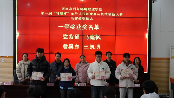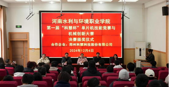 12月4日,机电工程系举办了备受瞩目的第一届“科慧杯”单片机技能竞赛与机械创新大赛决赛颁奖仪式。机电工程系党总支书记王建军、主任王利卿、副主任李戈、团总支书记刘月,郑州科慧科技股份有限公司总经理刘浩阳出席颁奖仪式,23级、24级参赛学生参加。
