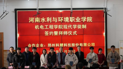 11月20日,机电工程系举行科慧现代学徒制签约暨拜师仪式。系党总支书记王建军、主任王利卿、副主任李戈,郑州科慧科技股份有限公司经理刘浩阳、企业导师和系师生代表参加。仪式由李戈主持。