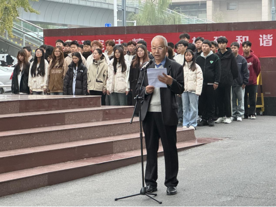 岳学超作国旗下讲话,他深刻阐述了抗美援朝战争胜利的伟大意义,号召全体师生要继承和发扬抗美援朝精神,坚定理想信念,勇于担当时代赋予的历史使命,为实现中华民族伟大复兴的中国梦贡献自己的青春力量。他强调,要是树立规矩意识,做遵规守纪的践行者;二要强化纪律观念,做自我提升的推动者;三要弘扬清风正气,做优良学风的引领者;四要践行青春誓言,做民族复兴的接班人。