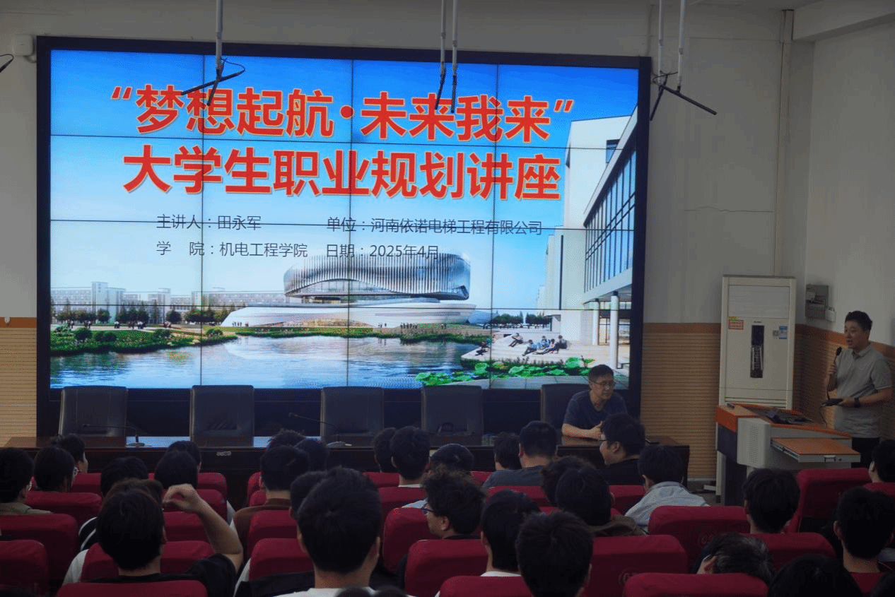 4月16日上午8时,机电工程学院电气自动化专业全体学生在学院报告厅参加了以"梦想起航 未来我来"为主题的大学生职业规划专题讲座。讲座由依诺电梯工程有限公司人力资源部田经理主讲,旨在通过专业指导帮助学生建立科学的职业发展理念,为未来职业生涯做好准备。