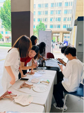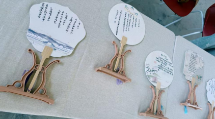 在互动体验区,书法社成员现场创作。社员们运笔娴熟、挥洒自如,作品既具备扎实的功底,又呈现出书法艺术的美感。活动还提供了书签和折扇等文创用品鼓励观众参与创作和互动,整个展区洋溢着浓厚的文化氛围。