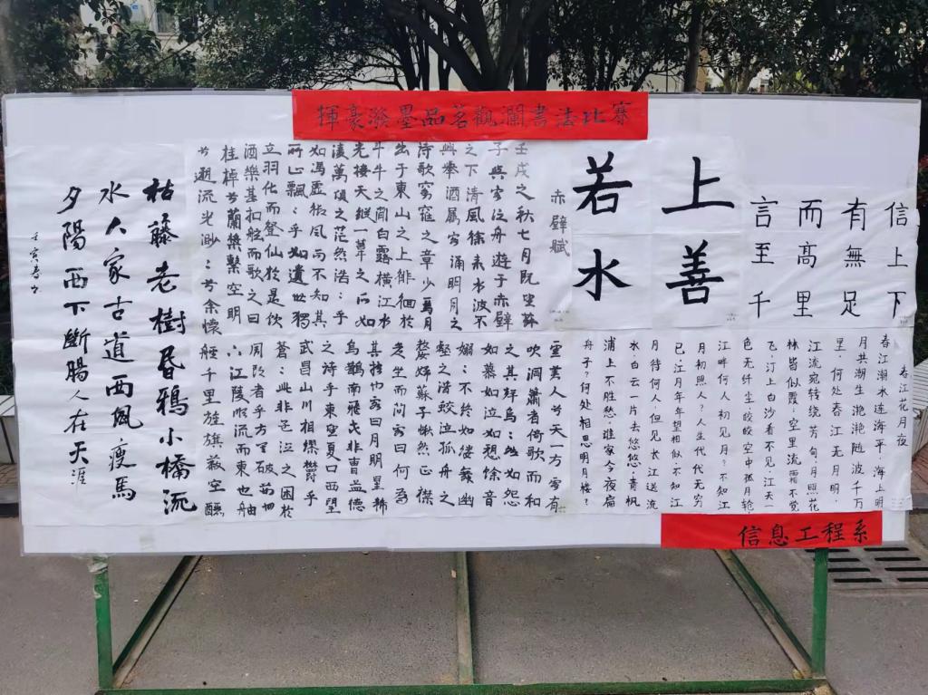 为丰富校园文化生活,3月28日-4月3日,信息工程系开展“弘扬传统文化,展笔墨风采”书法比赛。比赛分为硬笔书法和软笔书法两个项目,共收到400余份作品。经过初赛和复赛,最终评选出硬笔书法一等奖3名,二等奖5名,三等奖9名;软笔书法一等奖1名,二等奖2名,三等奖3名。