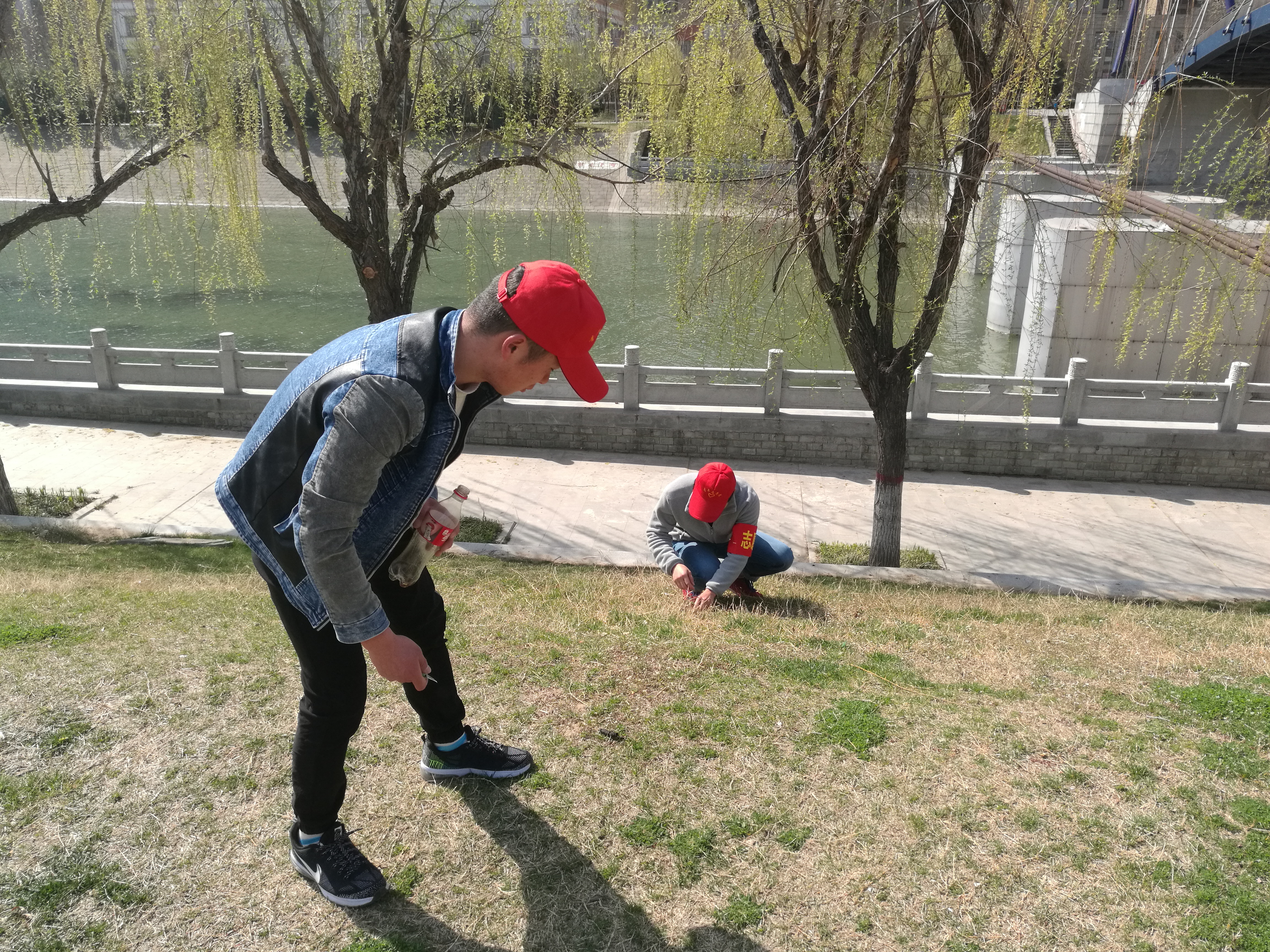 志愿者们到东风渠滨河公园把草坪和路边座椅上的垃圾都清扫干净,得到路过市民的称赞好评。