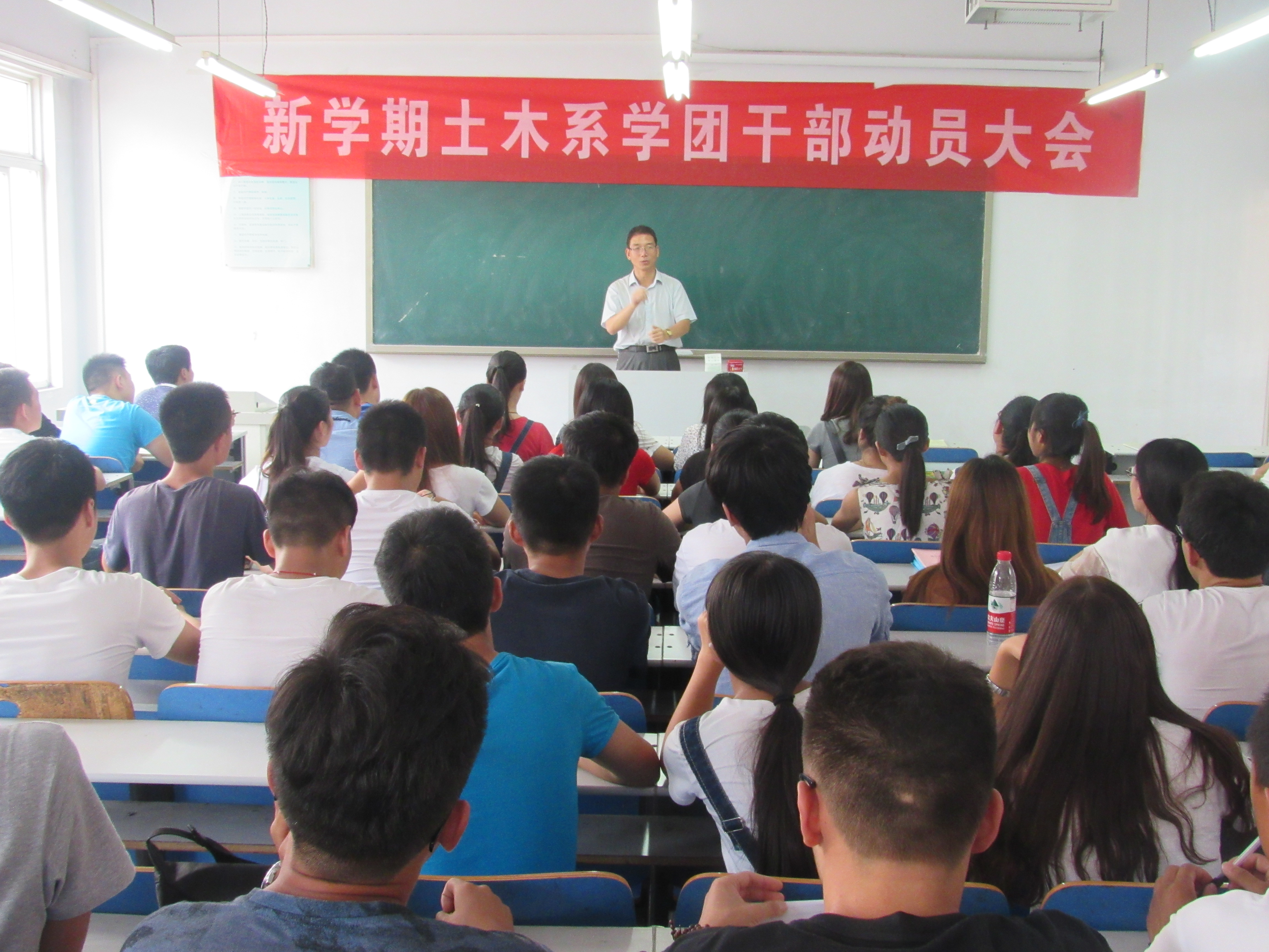 8月29日课外活动时间,土木工程系召开了新学期学团干部动员大会,全体学管人员及系团总支、学生会、各班学生干部参加了会议。会上,系党支部书记文琳针对新学期学生干部工作进行了部署,并鼓励和号召全体学生干部积极工作,加强实践锻炼,团结协作,共同搞好新学期各项学生工作。