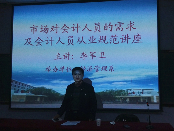 10月20日,经济管理系邀请河南金科联合会师计事务所合伙人、注册会计师李军卫所长,在北教讲堂1和讲堂2做了题为《市场对会计人员的需求和会计人员从业规范》的专题讲座。经济管理系会计电算化专业13级、14级高职学生以及12级五年制学生近300人参加了此次活动。
