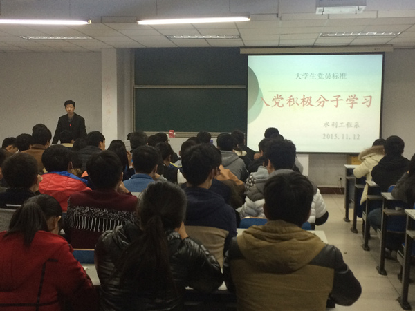 11月12日下午4:30水利工程系在南教405教室举行了“大学生党员标准”专题讲座,入党积极分子和团学干部参加了本次讲座系副主任王建军主讲。