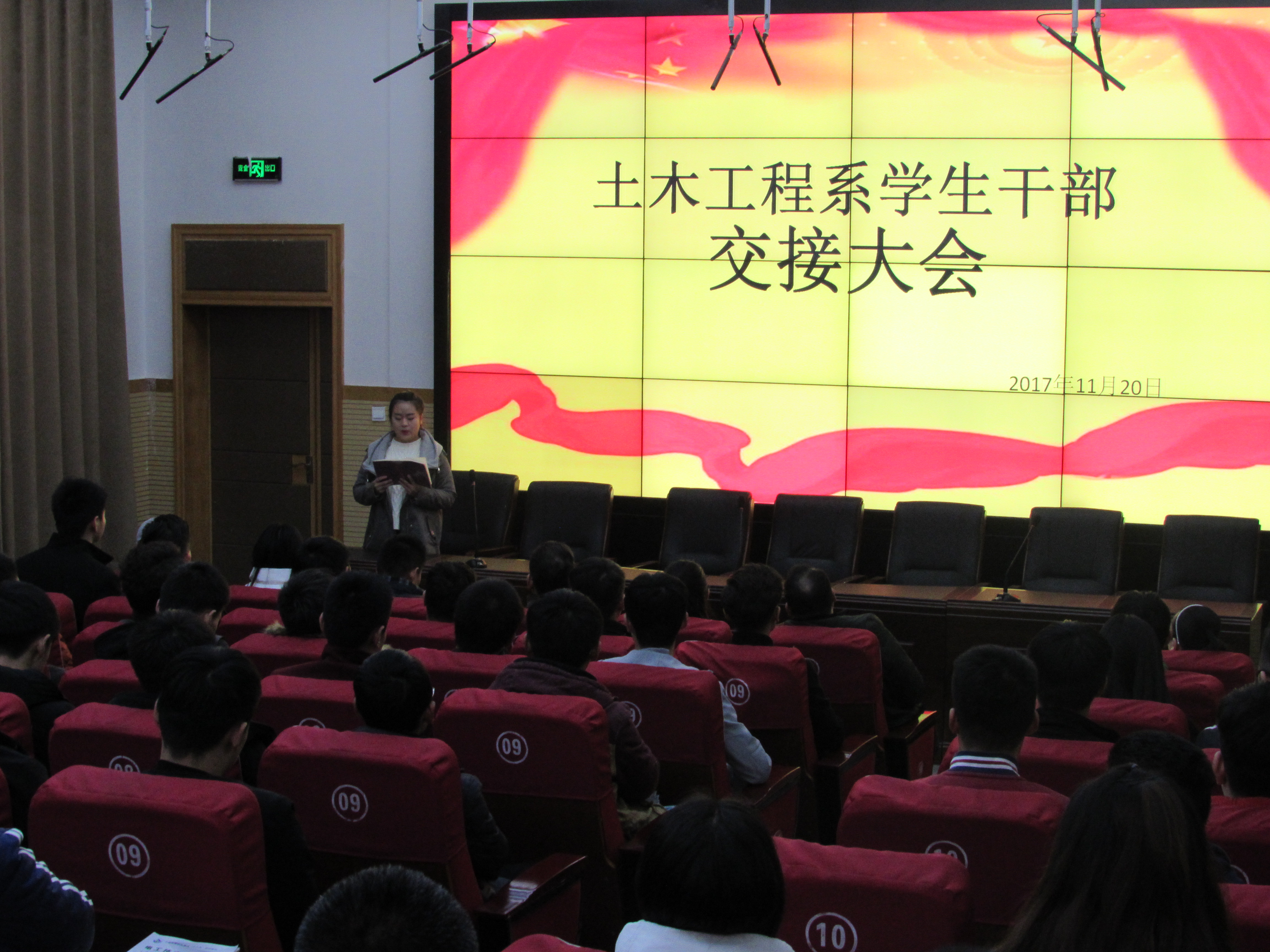 11月20日18:30,土木工程系在北教三阶举行学生干部交接大会,系党支部书记文琳、副主任钟含、团总支书记陈文,全体学管、辅导员老师及往届团学干部,各班班长、团支书参加大会。
